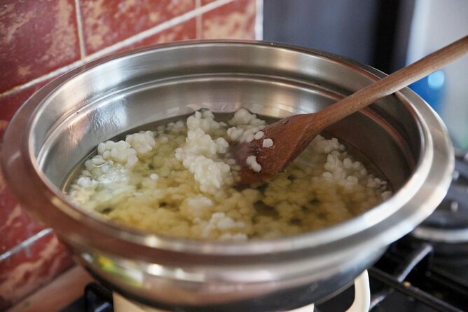 2. Do připravené nádoby si odvažte potřebné množství sojových kuliček a dejte je na vodní lázeň. Postupně míchejte vařečkou. Vosk se rozpouští zhruba mezi 40–50 °C.