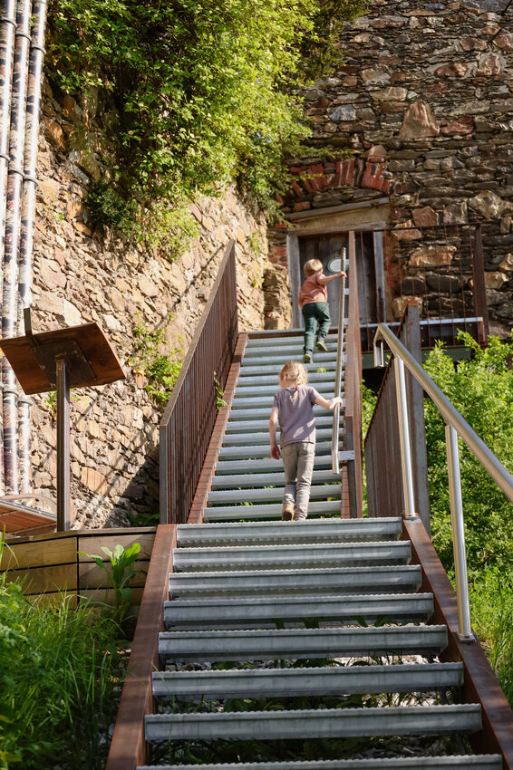 Langsam wird das Licht sanfter und wir genießen die frühen Abendstunden im wunderschönen Innenhof der Stadt Lofts. Im Schutz der dicken Stadtmauer ist es besonders gemütlich und man entdeckt an jeder Ecke neue Besonderheiten nach dem Gedanken „Altes mit Neuem“, Zäune werden zu Rankhilfen, Wagenräder zu Beeten, Trampelpfade mit Blättermotiven führen durch die liebevoll angelegten Kräuter- und Staudenbeete. Überall sind Hinweise und Schilder versteckt, die die Geschichte dieses Ortes zugänglich machen. Die alten Möbel, die hier verwendet wurden, Fundstücke, Hörstationen und Rätsel machen die Geschichte außerdem spürbar. Gleich beim Eingangsbereich gibt es außerdem noch eine Gemeinschaftsküche und einen Willkommensraum, das Dachgeschoss ist ein großer Seminarraum, der für Workshops und Veranstaltungen gebucht werden kann.