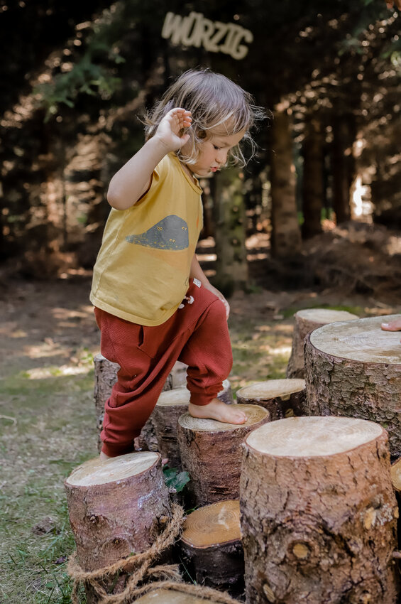 Die erste Station, der Sammelplatz, lädt uns inmitten eines Nadelwaldes dazu ein, den Moment mit allen Sinnen aufzusaugen. Während die Kinder über die Baumstämme balancieren, ziehe ich meine Schuhe aus und erfühle den mit Nadeln übersäten Waldboden mit meinen Fußsohlen. Er ist so weich, dass er bei jedem Schritt nachgibt. Die Schritte verlangsamen sich wie von selbst. Es riecht nach Erde, Moos und dem Aroma von ätherischen Ölen von Fichte und Tanne.