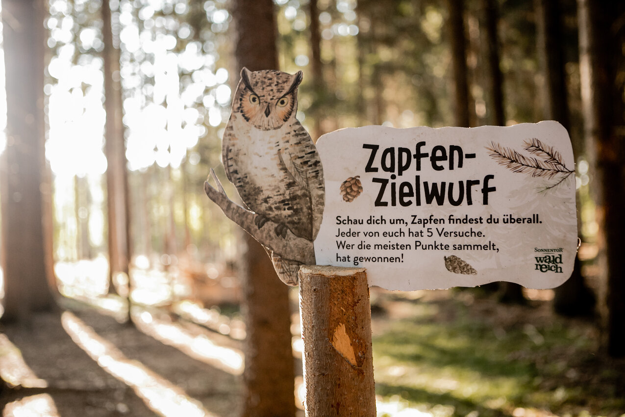 Wir haben erfahren, dass Bäume uns ähnlicher sind, als wir glauben. Doch wie sieht es mit den anderen Waldbewohnern aus? Zweifelsohne ist der Specht einer der aktivsten Klettervögel. Die Station „Waldhochhaus“ setzt sich detailliert mit der Thematik auseinander. Kindgerecht, interaktiv und hoch interessant, auch für uns Erwachsene. Welche fleißigen Waldbewohner ihr noch im Wald-Reich beobachten könnt, werdet ihr im Anschluss an die Waldolympiade sehen!  Mittlerweile nehmen wir das Totholz, welches hier gelegentlich am Wegesrand zu finden ist, genauer unter die Lupe. Die Kinder begutachten die Vielfalt an kleinen und großen Baumschwämmen und siehe da, wir werden sogar fündig, was essbare Pilze betrifft. Aus dem Moos heben sich eine Reihe eierdotterfarbener Pilze ab: Eierschwammerl! Sie zählen neben Beeren wie Heidelbeere, Brombeere und Walderdbeere zu den beliebtesten Waldfrüchten und sind zudem essentielle Kooperationspartner der Bäume.