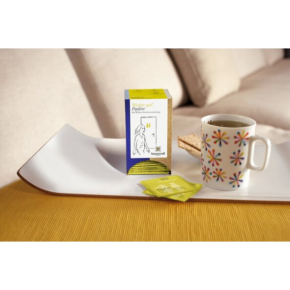 Foto von einer Packung Pipifein Tee Bio-Kräuter-Früchteteemischung, rechts eine Teetasse und in einer Schüssel Knäckebrot.