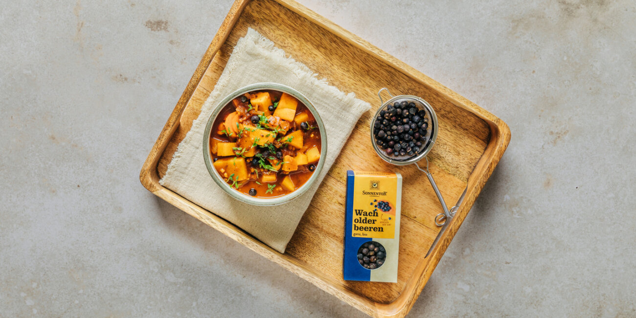 Der gemeine Wacholder, wie er botanisch genannt wird, hat ein sehr weites Verbreitungsgebiet. Von Nordamerika über Südgrönland, Nordafrika, Europa bis nach Asien macht er insgesamt etwa 40 Prozent der Nadelbaumbestände aus. SONNENTOR bezieht ihn unter anderem von einem direkten Handelspartner aus Bosnien und Herzegowina. Die beerenförmigen Zapfen wachsen rispenartig an den Zweigen des Zypressengewächses. Sie sind es, die in der Küche zum Einsatz kommen und dort für guten Geschmack sorgen.