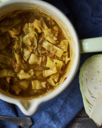 1. Das Kraut vom Strunk befreien und in rechteckige Stücke schneiden (ca. 1x1 cm). Zwiebel und Knoblauch schälen und in kleine Stücke schneiden. Kokosöl in einem Topf erhitzen, darin das Kraut, Zwiebeln und Knoblauch anrösten. Wenn das Gemüse etwas Farbe bekommen hat, einen Esslöffel Mehl hinzufügen und kurz mitrösten. Mit Gemüsebrühe aufgießen und kräftig umrühren. Eventuell etwas Wasser hinzufügen, das ganze sollte eine sämige Konsistenz bekommen. Mit Curry, Salz und Pfeffer abschmecken.
