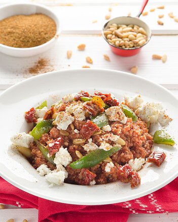 Couscous, getrocknete Tomaten und Pinienkerne dazugeben und durchmischen. Zuletzt die Schafkäsewürfel beigeben und mit etwas Adios Salz! Scharf verfeinern.